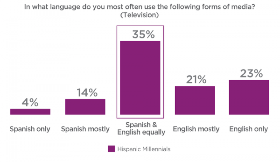 A large amount of millennial Latinos are interested in bilingual programming. While 44 percent say they watch TV most often in English, or mostly English, HMP found that 35 percent preferred programming in both Spanish and English equally. And 23 percent said that the availability of Spanish-language programming was why they see themselves committing to pay TV rather than going online streaming only.