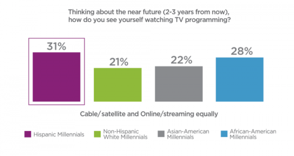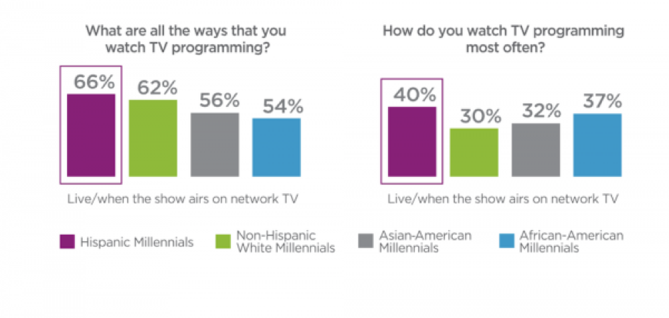 Of all the millennial groups (White, Black, Latino, and Asian-American) studied by HMP, Latinos were the most likely to watch live television sometimes, and also as a regular habit.